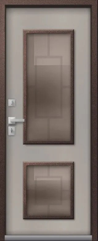 В конструкции двери Т-1 PREMIUM используется двухкамерный стеклопакет толщиной 48 мм, цвет Бронза с низкоэмиссионным энергосберегающим покрытием, сохраняющим тепло внутри дома. С внешней части стеклопакета установлена декоративная металлическая решетка. Эта дверь станет украшением Вашего дома